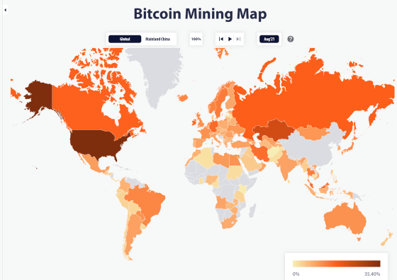 マイニングが活発であることを示しており、中国はほぼゼロの灰色です。