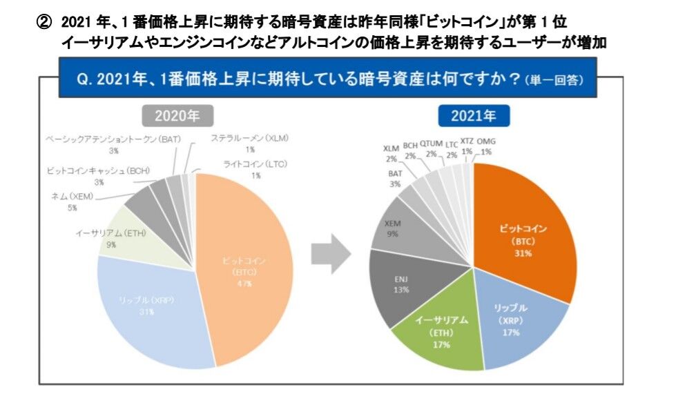 GMOコインは3月17日から31日までの間、同社サービスを利用する3458名のユーザーを対象にウェブアンケートを実施。「2021年に一番価格上昇を期待している暗号資産は何か」の質問に対して、31%の回答者がビットコイン(BTC)と答えた。昨年の調査では、ビットコインと答えたのは47%だった。