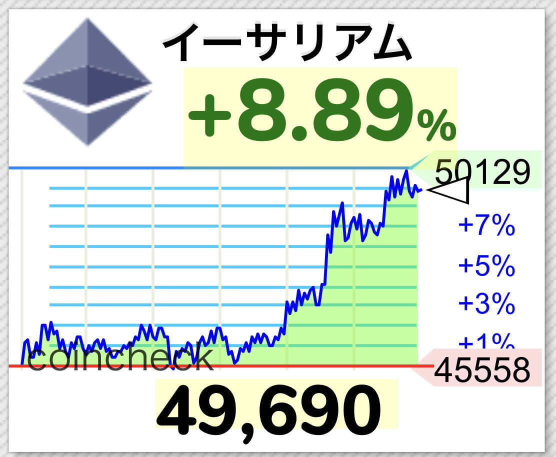ETH超速報:イーサリアム価格はついに5万円を回復🎉コロナショックから約5倍。2018年3月の最安値38000円を超え、同年8月水準。ガス代は430倍