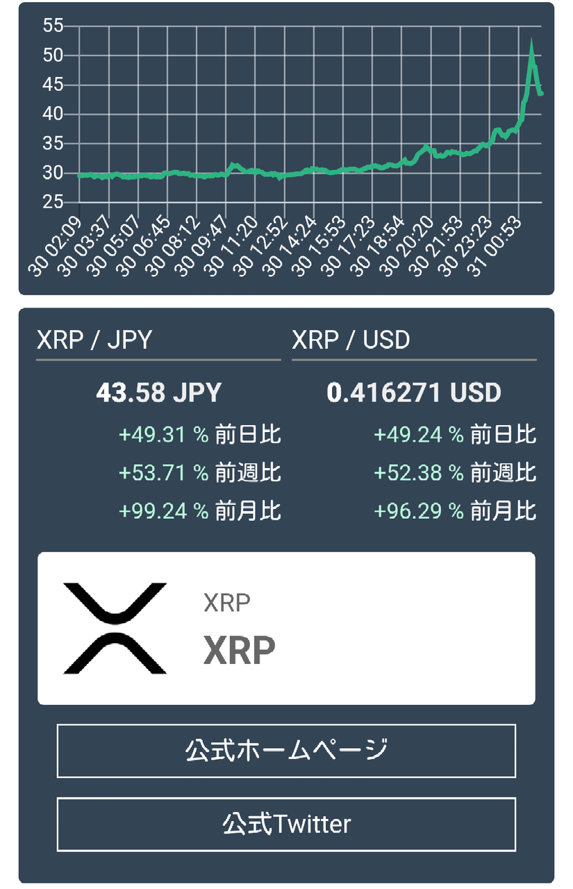 【衝撃】仮想通貨リップル、深夜に一時53円、80%もの大暴騰でお祭り騒ぎになるwwwwwwww【XRP】