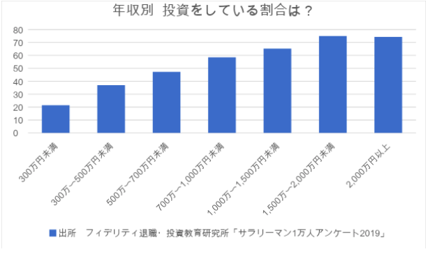 年収300万円未満のサラリーマンで投資を行っている人は21.5%。投資家比率は年収が上がるにつれて上昇し、年収300万~500万円未満では30%台半ば、年収500万~700万円未満になると半数近くの人が投資を行っていることがわかります。